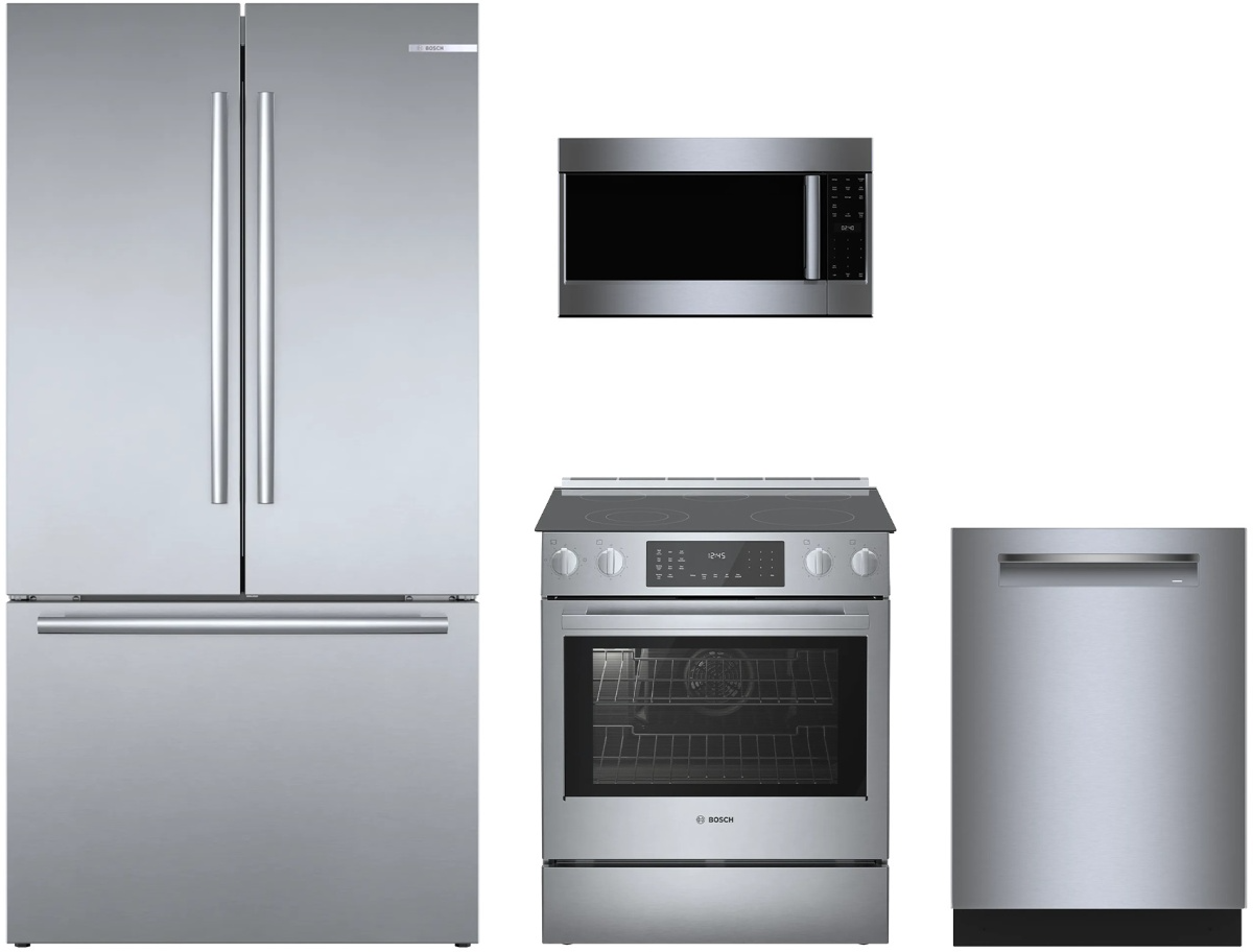Bosch 4 Piece Stainless Steel Kitchen Package with French door refrigerator, built in dishwasher, slide in electric range and over the range microwave.Read More