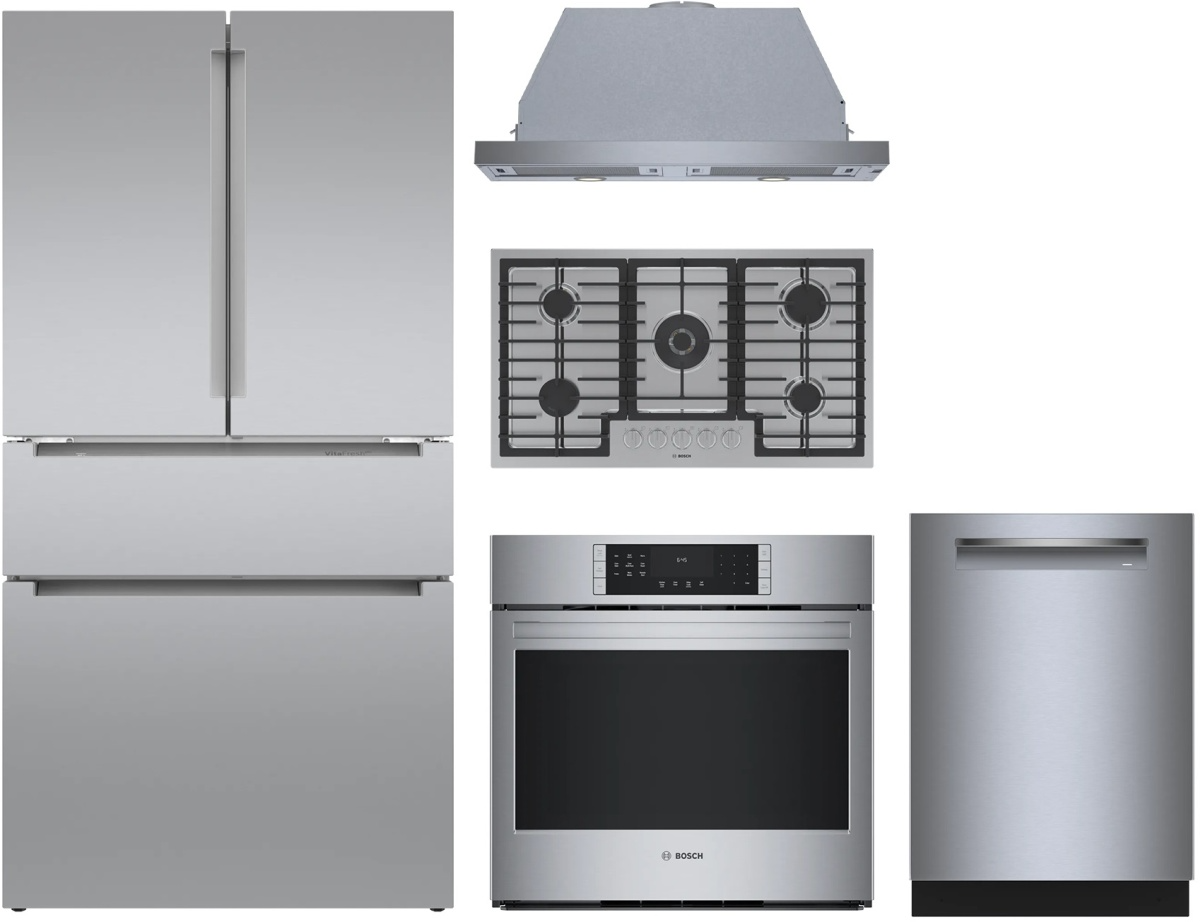 Bosch 5 Piece Stainless Steel Kitchen Package with French door refrigerator, built in dishwasher, single electric wall oven, gas cooktop and under cabinet range hood.Read More