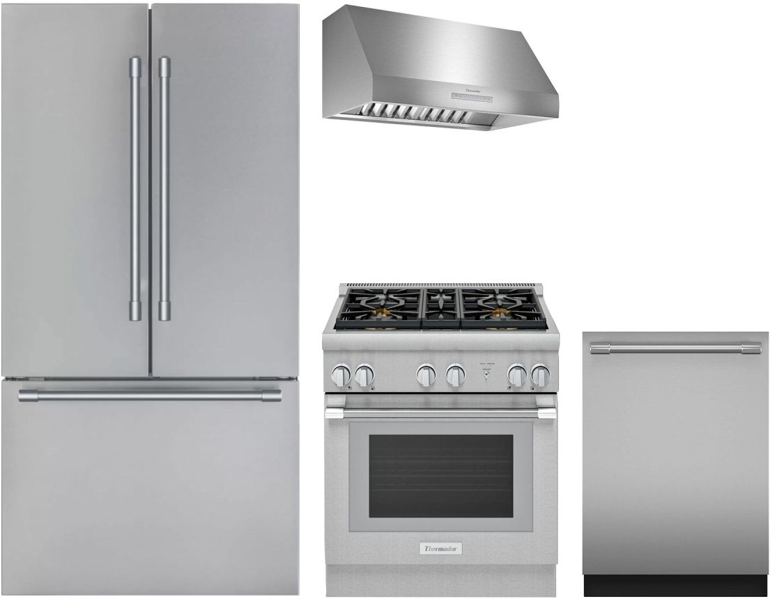 Thermador® 4 Piece Stainless Steel Kitchen Package with a French door refrigerator, freestanding gas range, under cabinet range hood, and built in dishwasher.Read More