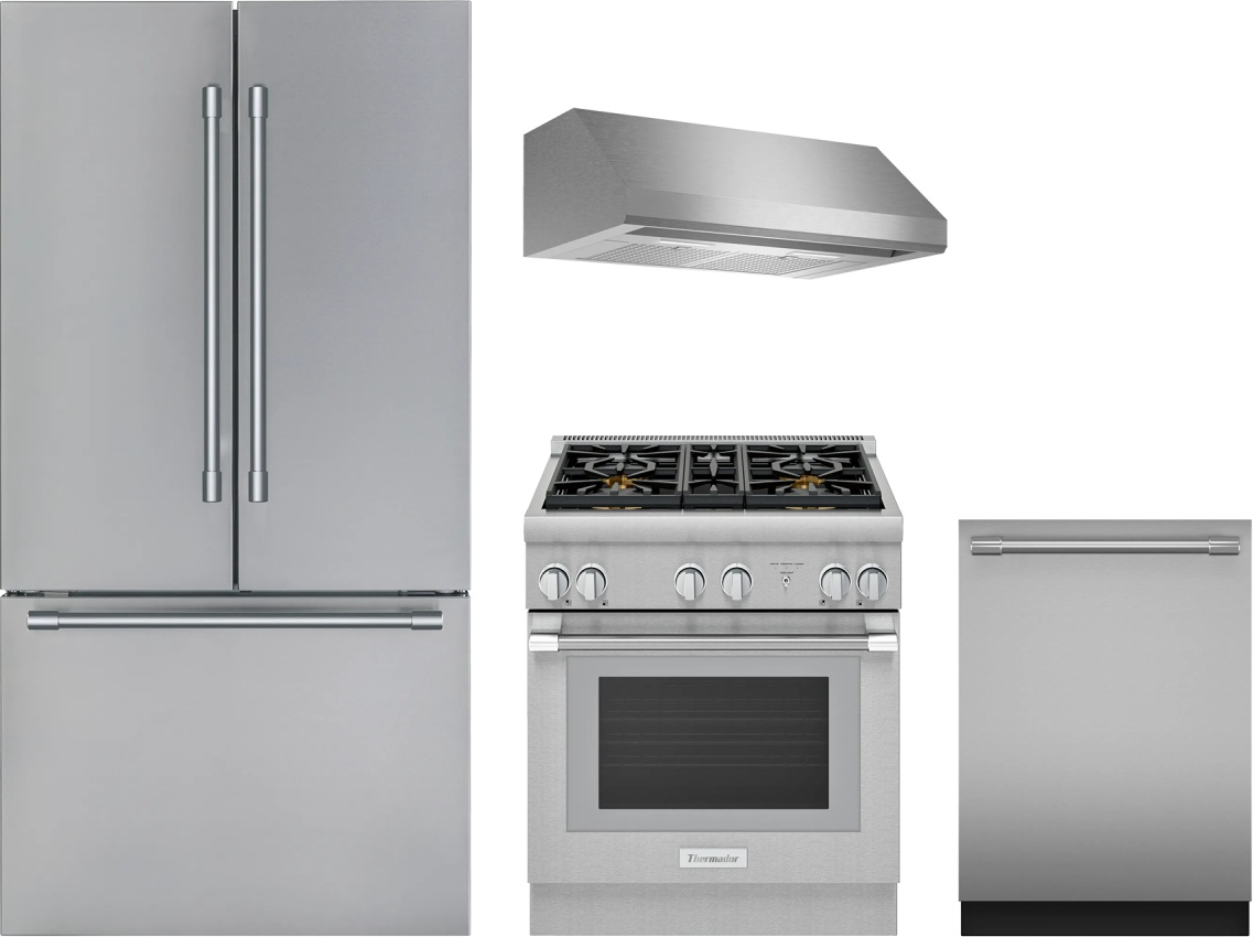Thermador® 4 Piece Stainless Steel Kitchen Package with a French door refrigerator, freestanding dual fuel range, under cabinet range hood, and built in dishwasher.Read More