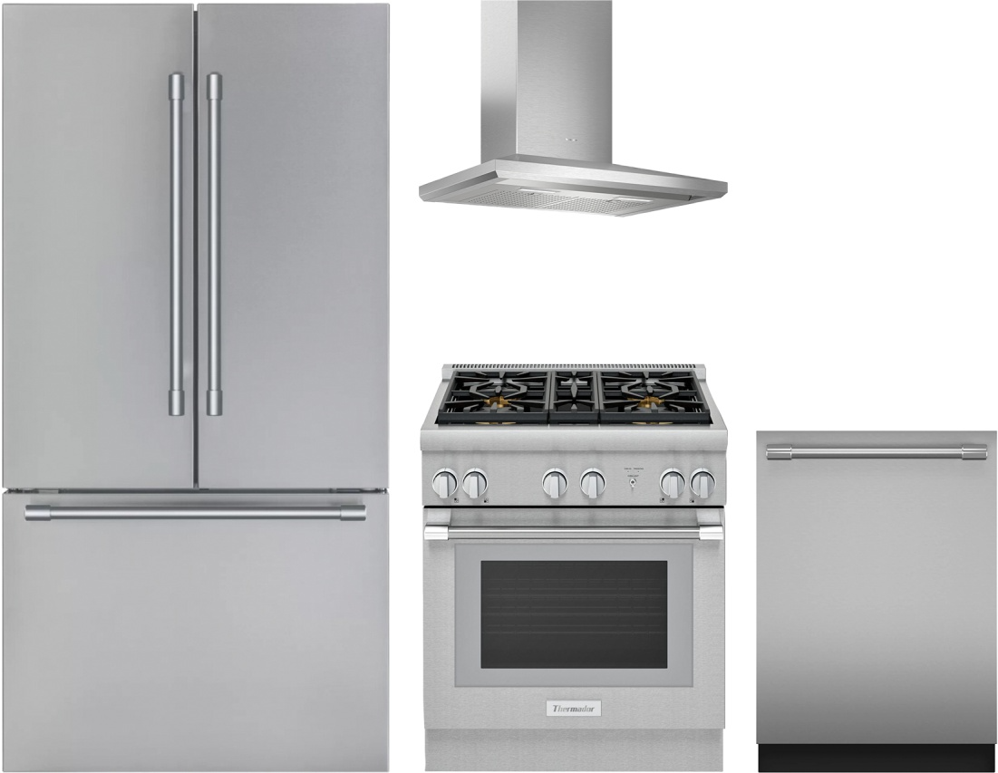 Thermador® 4 Piece Stainless Steel Kitchen Package with a French door refrigerator, freestanding gas range, wall mounted range hood, and built in dishwasher.Read More